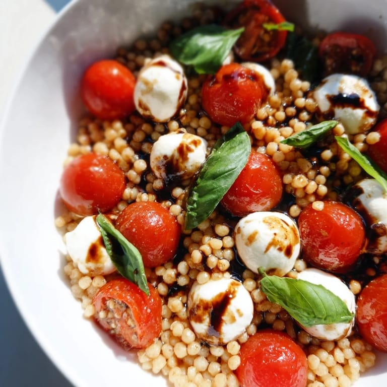 Save to Pinterest My neighbor Lucia showed up one August afternoon with a bowl of this salad, still cool from her fridge, and I ate it standing in my kitchen doorway. The couscous had soaked up just enough balsamic to taste sweet and tangy at once, and the mozzarella was so soft it practically melted on my tongue. She said she'd made it because her tomatoes were splitting on the vine and she needed to use them fast. I asked for the recipe immediately, and she laughed and said there wasn't one, just whatever felt right. I've been making my own version ever since, and it always reminds me of that summer heat and her generous spirit.