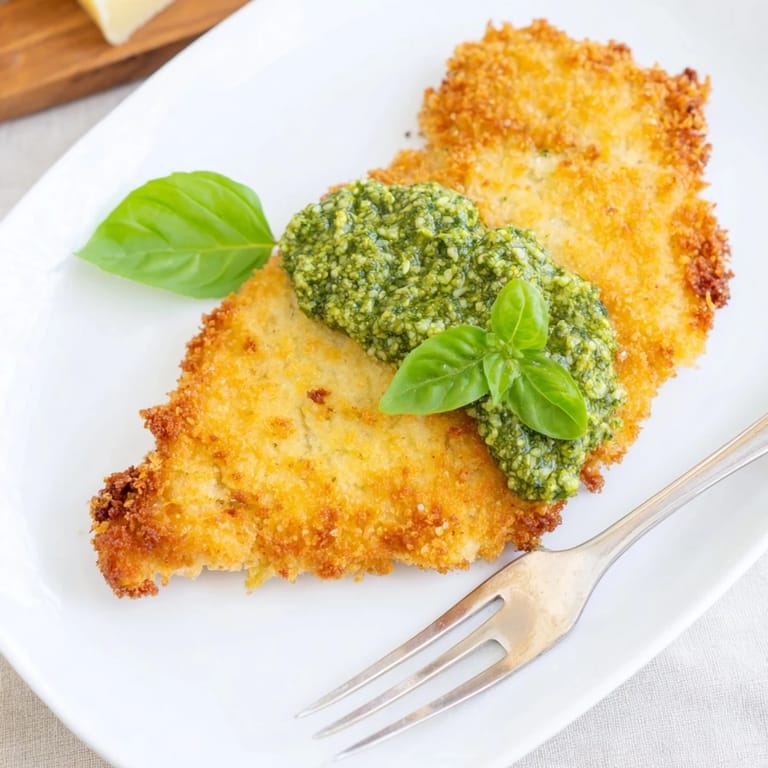 - Arrange the crispy cutlets on a platter, spoon a generous dollop of pesto over each one, and garnish with fresh basil and lemon wedges. Serve immediately while the crust is still crackling.