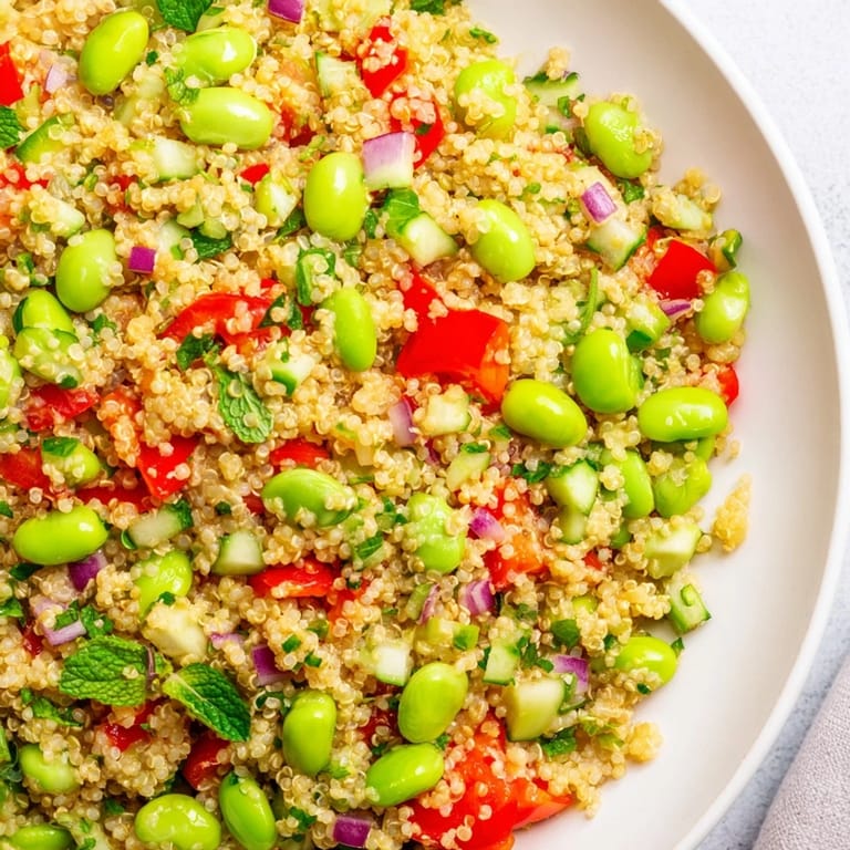 - Add the cooled quinoa and edamame to the vegetables along with the fresh herbs. Pour the dressing over the top and toss gently.