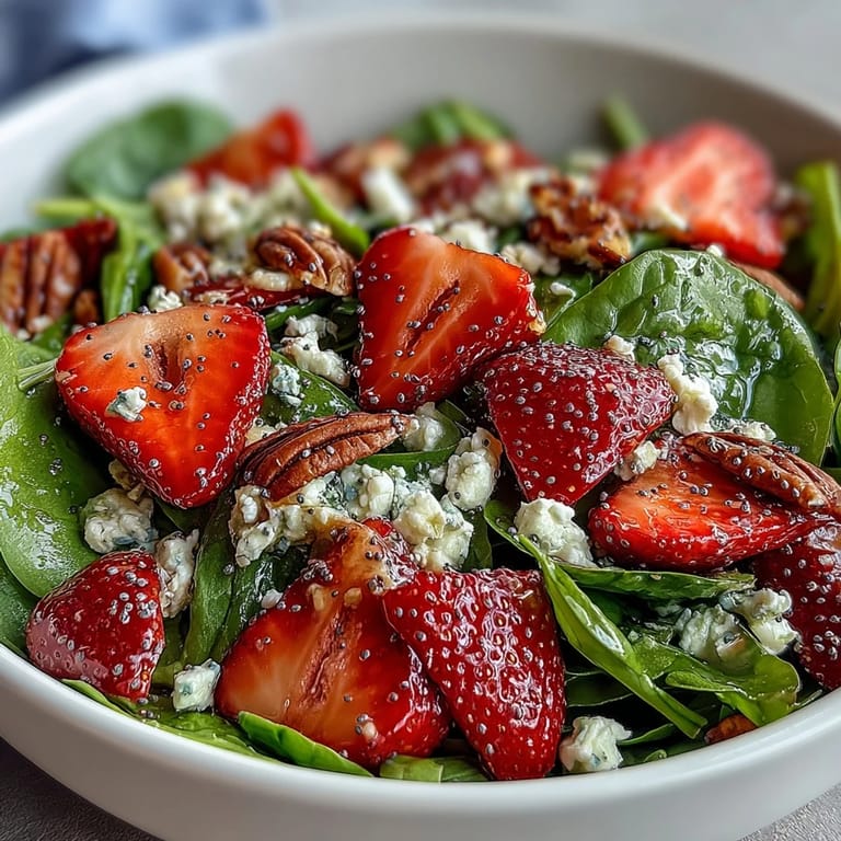 Save to Pinterest My neighbor knocked on my kitchen door one Tuesday afternoon holding a basket of strawberries so red they looked almost impossible. She'd grown them herself and insisted I do something special with them. That's when I remembered a salad I'd eaten years ago at a farmer's market stand, the kind where one bite made you stop and really taste spring. I've been making variations of it ever since, and this version with baby spinach, creamy feta, and that distinctive poppy seed dressing has become my go-to when I want something that feels both light and substantial.