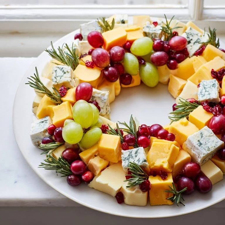 Save to Pinterest A festive and eye-catching cheese display shaped like a holiday wreath, featuring a colorful assortment of cheeses, fruits, and garnishes perfect as a centerpiece for any gathering.