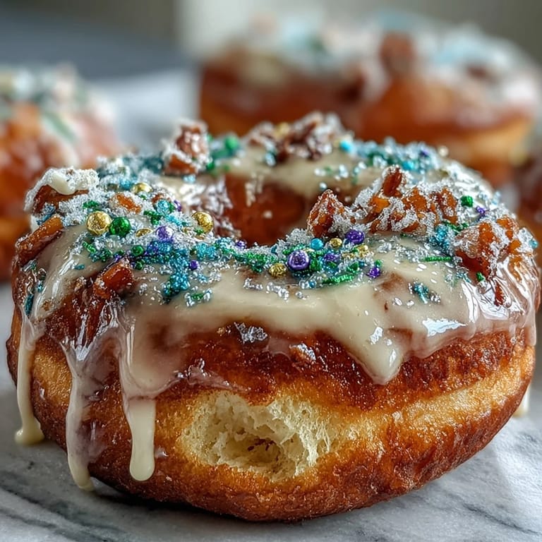 Save to Pinterest There's something about Mardi Gras season that makes me want to bake things that feel like celebration in edible form. Last February, I stood in my kitchen watching those iconic purple, green, and gold colors everywhere—on decorations, in windows, on people's clothes—and thought, why not on donuts? These King Cake donuts came to life on a rainy Tuesday afternoon when I decided that baked (not fried) was the way to go, keeping them light enough to eat three in a row without guilt. The lemon zest surprised me with how much it brightens the warm spices, and suddenly I wasn't just making dessert—I was making a little piece of New Orleans magic in my home.