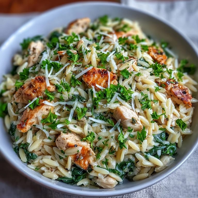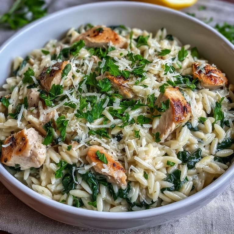 Save to Pinterest My neighbor knocked on the door one April afternoon with a handful of fresh spinach from her garden and a question: what could she make that wasn't heavy but still felt like dinner? We ended up in my kitchen, and by pure instinct, I reached for orzo, lemon, and chicken. That first spoonful—creamy, bright, utterly simple—became the dish I make whenever spring finally arrives and I'm tired of thinking too hard about what to cook.
