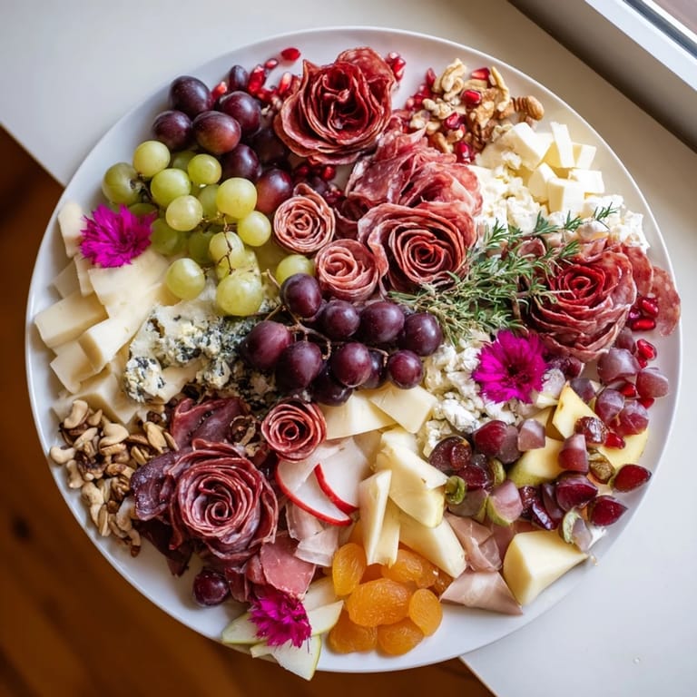 Save to Pinterest A stunning and festive charcuterie centerpiece featuring elegantly arranged meat roses, perfect for holiday gatherings and parties.