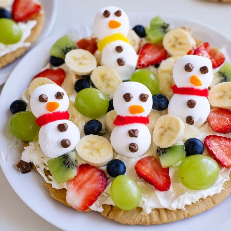 Save to Pinterest A playful and colorful dessert pizza featuring sugar cookie crust, creamy frosting, and fresh fruit, decorated to resemble melting snowmen—perfect for kids and winter celebrations.
