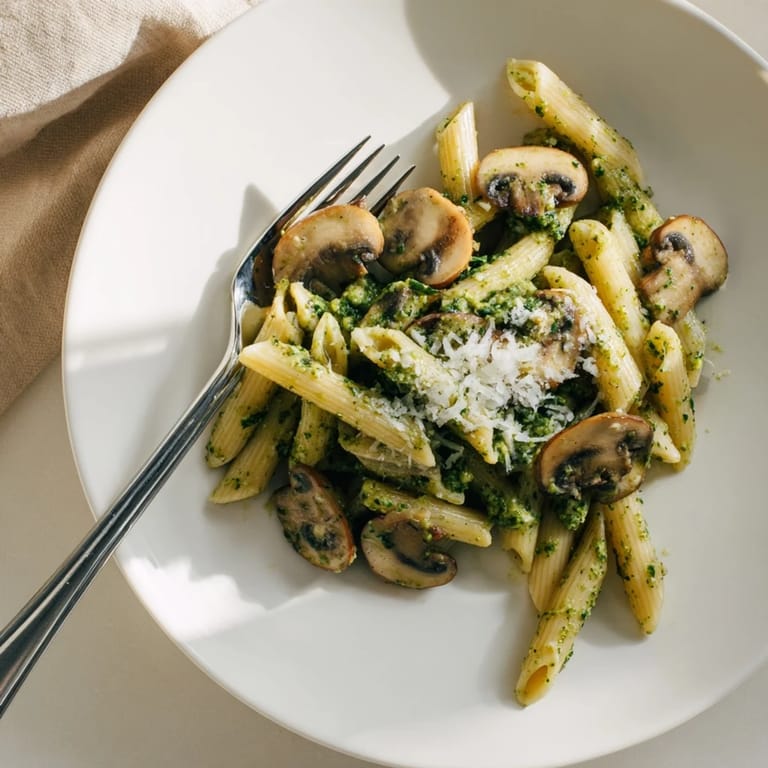 Save to Pinterest Some nights call for comfort without the fuss, and that's when I reach for mushrooms and pesto. I'd been craving something creamy but not heavy, something that felt like a hug without putting me to sleep. The smell of garlic hitting hot butter always pulls me back into the moment, and when those mushrooms start to brown and release their earthy sweetness, I know I'm halfway to happiness. This pasta came together on a Tuesday when I had no plan and even less energy, but it tasted like I'd been thinking about it all day.