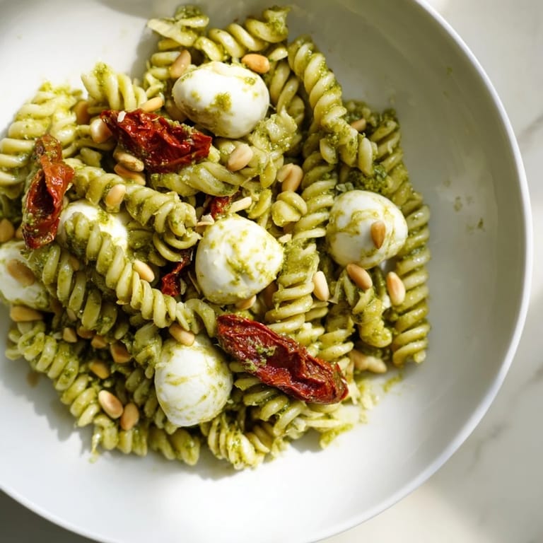 The genius of this salad is that it relies on good ingredients doing their job without needing complicated technique. The pesto carries most of the flavor weight, while the sun-dried tomatoes add concentrated sweetness that balances it. The mozzarella stays soft and creamy even at room temperature, and the toasted pine nuts give you a textural surprise in every bite. It's genuinely hard to mess up once you understand that the pasta needs to be cool and the pesto needs to coat everything evenly.