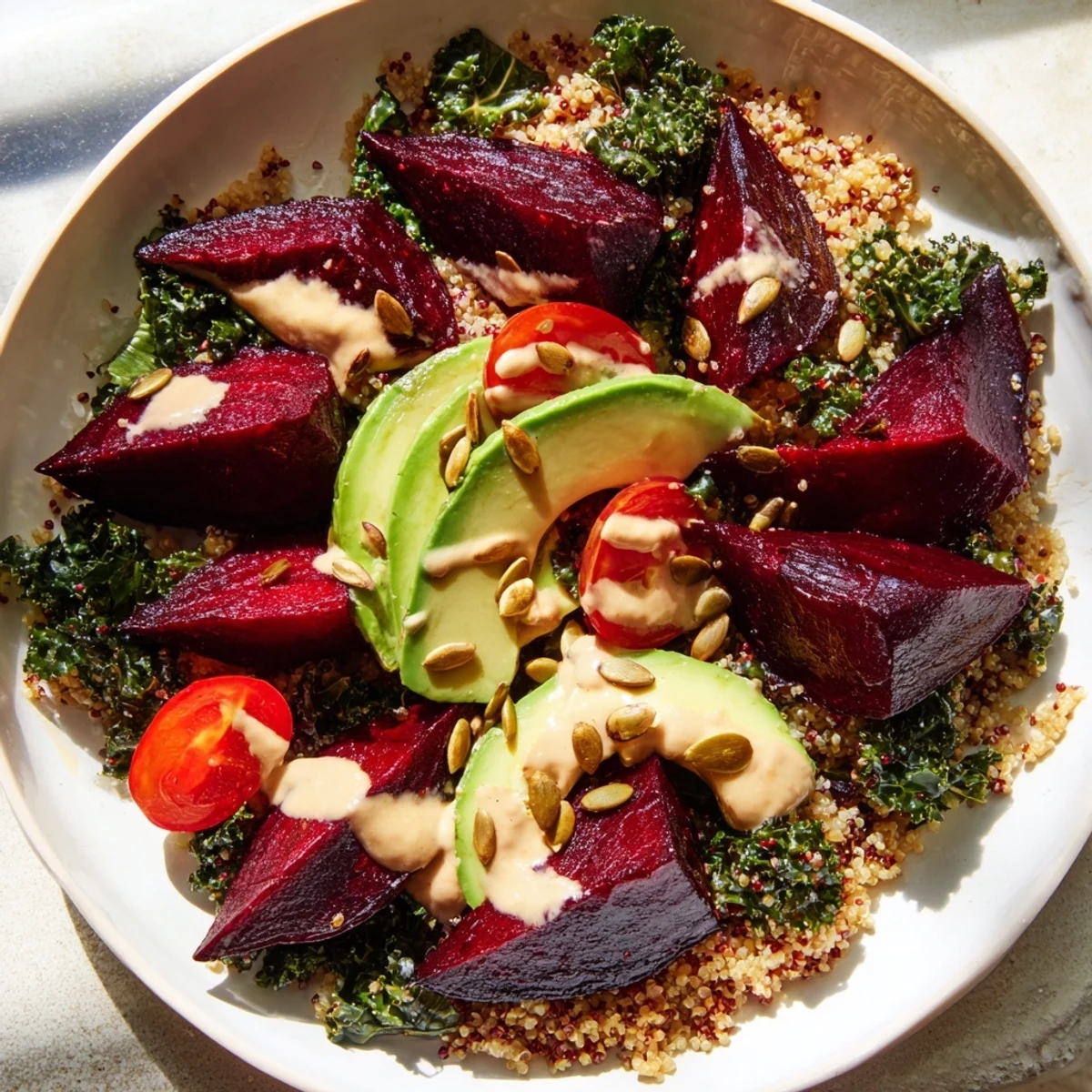 Save to Pinterest A vibrant, nutrient-packed bowl featuring earthy roasted beets, fluffy quinoa, and crisp kale, all brought together with a creamy tahini dressing. Perfect for a wholesome lunch or light dinner.