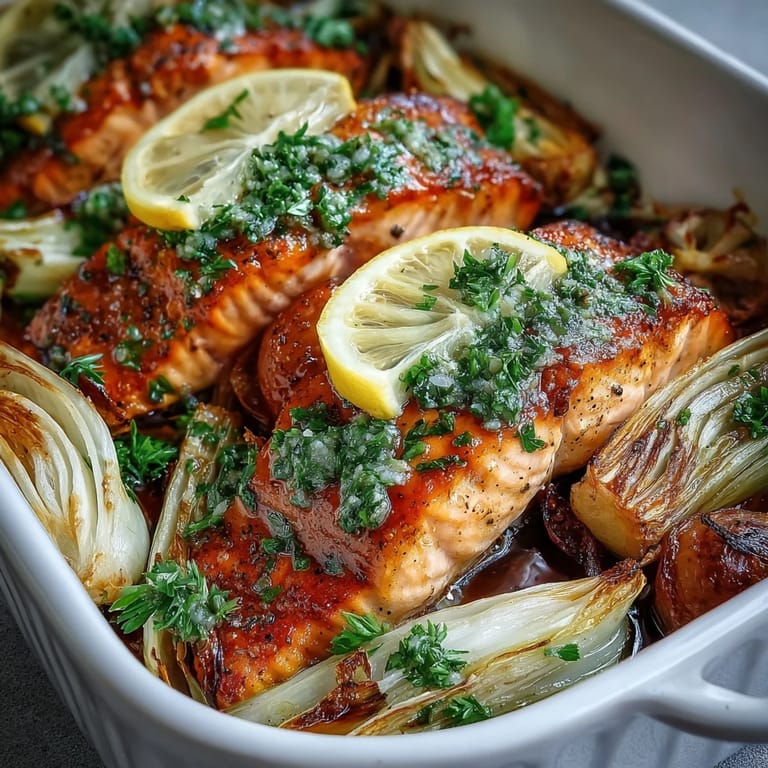 I made this for my sister once when she came over after a long day at work. She walked in, saw the whole dinner coming together on a single sheet pan, and asked if I'd hired a chef. The lemon slices had crisped up at the edges, the onions were soft and sweet, and the salmon flaked apart under a fork. We ate it straight from the oven, standing at the counter, dipping bites into the parsley dressing like it was some kind of ritual.