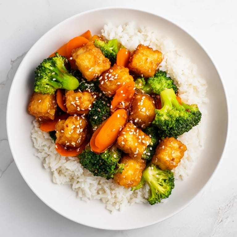 Save to Pinterest A flavorful, budget-friendly vegetarian dish featuring crispy tofu and tender broccoli tossed in a savory sesame sauce, served over steamed rice.