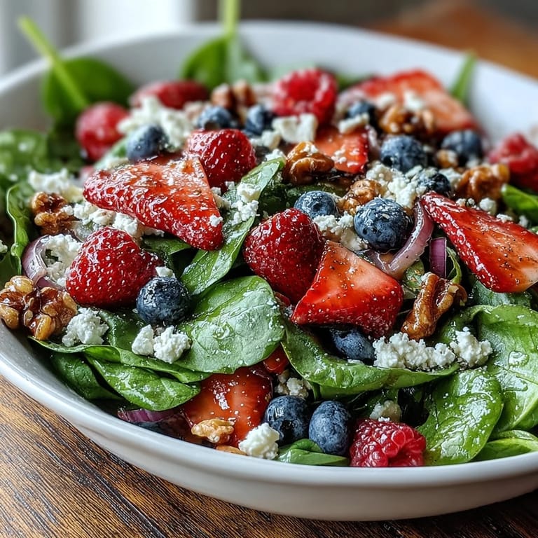 Save to Pinterest There's something about the moment you bite into a salad that feels effortless yet intentional—when the spinach is still dewy, the berries burst on your tongue, and you realize you didn't need to spend hours cooking to feel nourished. I discovered this bowl on an afternoon when I had nothing in the fridge except spinach that needed eating and a punnet of berries going soft in the corner. The goat cheese was a last-minute grab, the walnuts were already toasted, and somehow it all clicked together like a perfect accident waiting to happen.