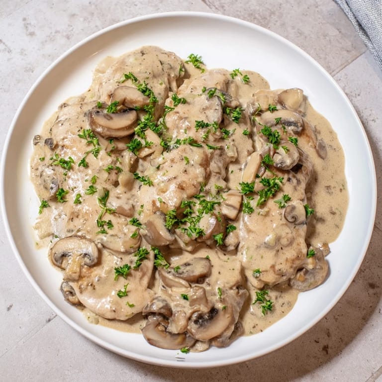 - Mushroom Sauce: 1 (10.5 oz / 300 g) can condensed cream of mushroom soup, 1/2 cup (120 ml) low-sodium chicken broth, 1/2 cup (120 ml) heavy cream, 1 small onion (finely chopped), 8 oz (225 g) cremini or white mushrooms (sliced), 2 cloves garlic (minced), 1 teaspoon dried thyme (or 1 tablespoon fresh, chopped), salt and black pepper to taste, 1 tablespoon fresh parsley (chopped, for garnish)
